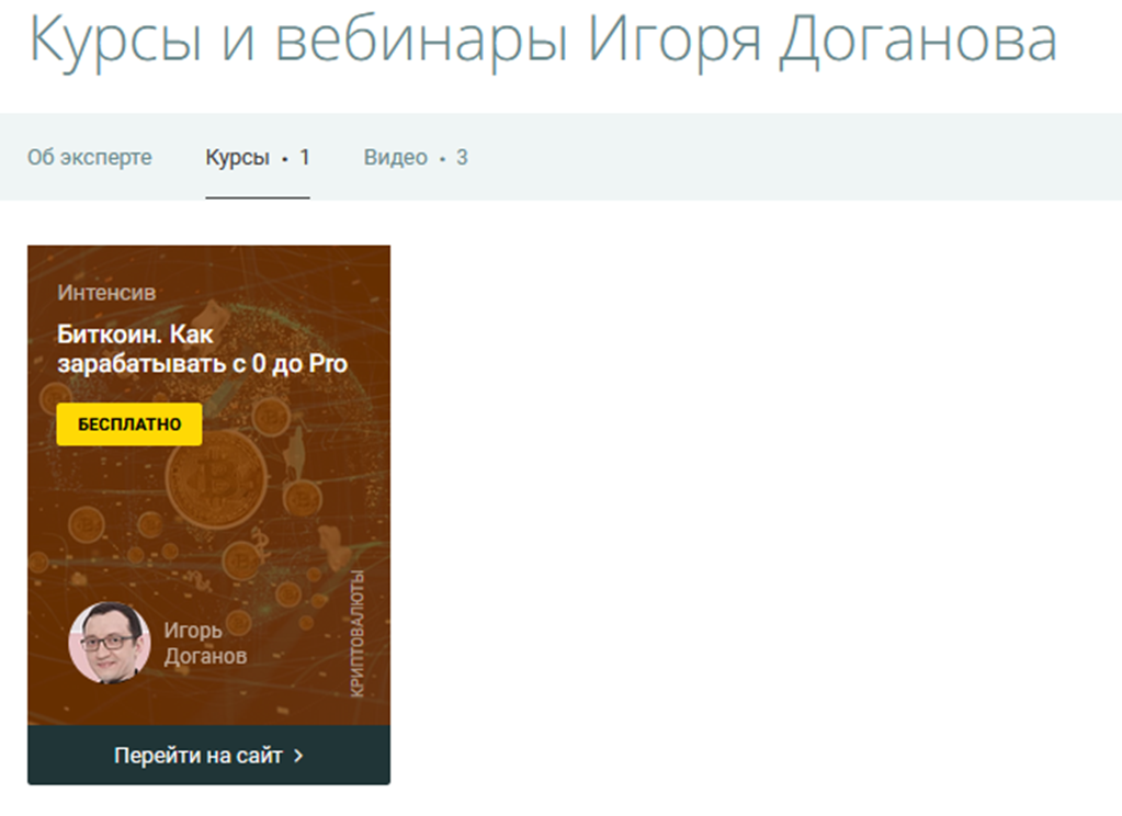 В деятельности Игоря Доганова признаков мошенничества не выявлено. Это действующий аналитик, специализирующийся в сфере торговли криптовалютой. Дополнительно проводит вебинары, предлагает интенсивы на тему заработка с Биткоин для новичков. Но большой популярностью его обучение не пользуется, материалы скорее представляют интерес для начинающих трейдеров. Среди преимуществ – наличие у Игоря практического опыта и проведение бесплатных курсов.