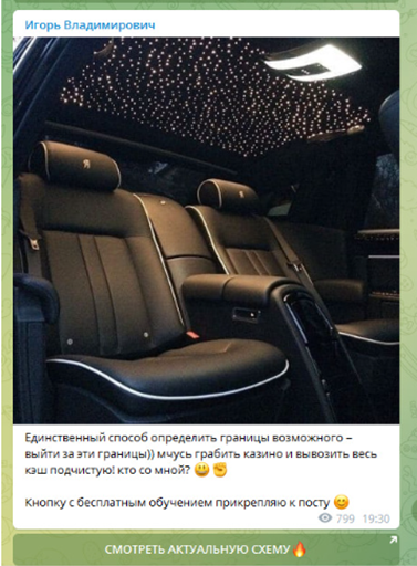 В доказательство мужчина активно демонстрирует фото дорогих авто, якобы принадлежащих ему, статусные часы и видео из люксовых гостиниц. Эти публикации на канале «Игорь Владимирович» необходимы лишь для одной цели – привлечения пользователей в схему заработка. Под каждым таким мотивационным постом Игорь оставляет ссылку на свой личный чат Igorvladrich,где можно ему написать и пройти обучение.