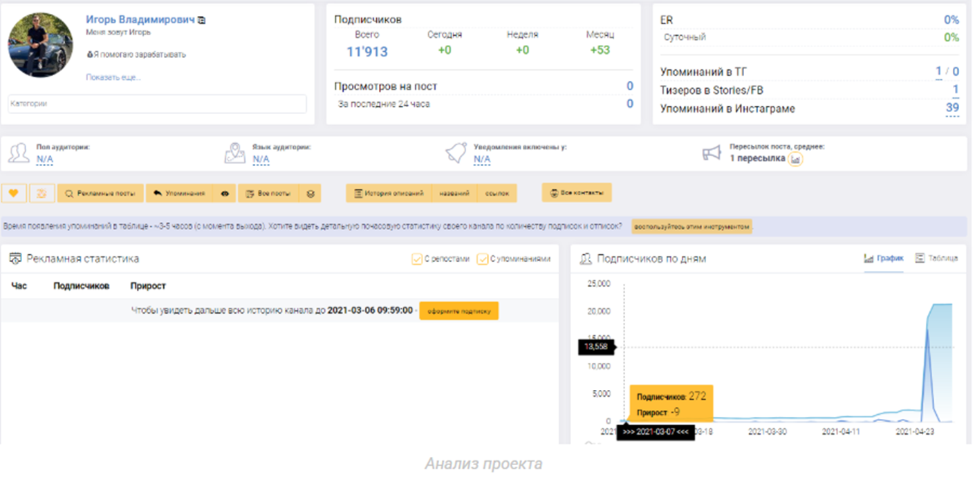 Анализ канала «Игорь Владимирович» показал, что аудитория накручена. Статистика просмотров явно не соответствует числу подписчиков и популярность аккаунта низкая, прирост аудитории мизерный. Такую стратегию ведения каналов используют мошенники.