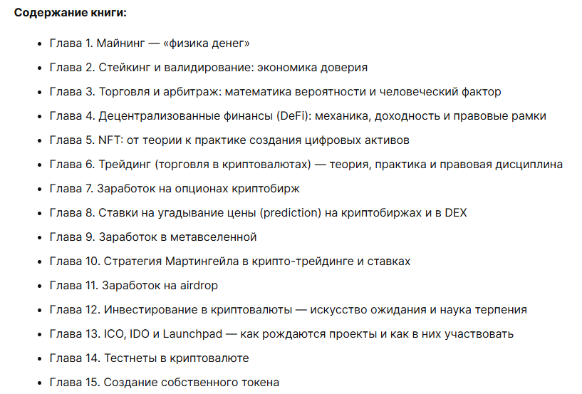 На маркетплейсах, где продается книга, есть подробное оглавление работы. Согласно ему, автор рассказывает о майнинге, стейкинге, арбитраже, эирдропах, тестнетах и других инструментах для получения крипты. Это большой плюс: читателю не придется покупать «кота в мешке», он заранее знает, о чем пойдет речь в книге.