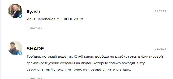 Оставьте свой комментарий об Илье Черепанове. Наши проверки помогают не стать жертвой обмана, читайте их.