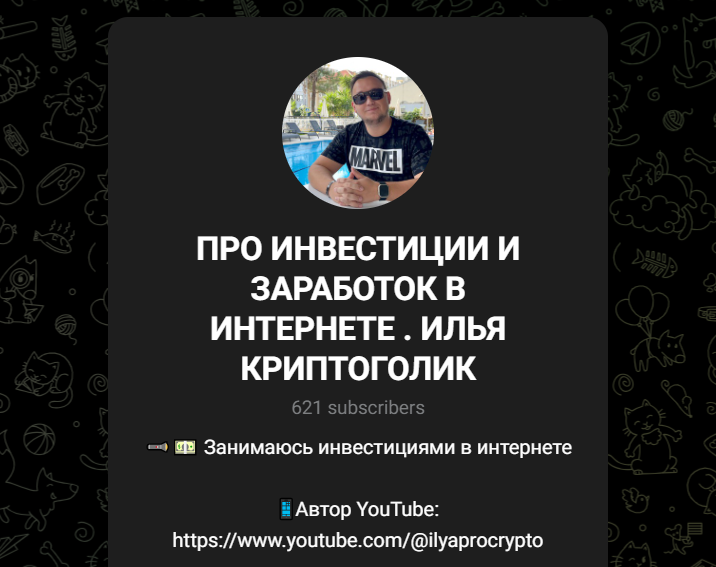 На канале ПРО ИНВЕСТИЦИИ И ЗАРАБОТОК В ИНТЕРНЕТЕ ИЛЬЯ КРИПТОГОЛИК (@lisinvestments) 621 подписчик, аудитория не выглядит накрученной. Также он ведет канал на Ютубе @ilyaprocrypto на тему инвестиций. Автор проекта работает открыто, не прячет лицо, постоянно выпускает видео, на которых находится в кадре. Его личный аккаунт в ТГ — @ilyaprocrypto.