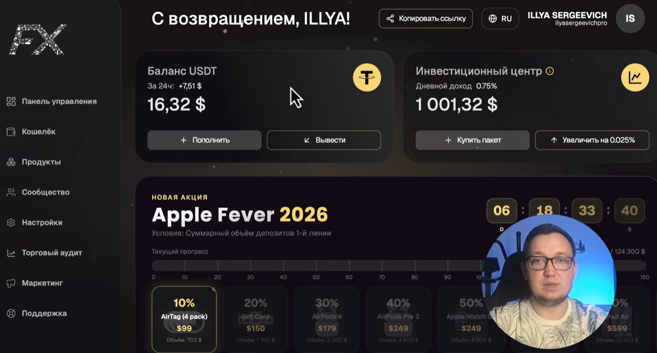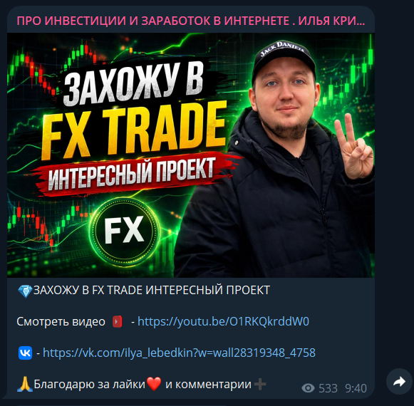 Деньги Илья ни за что не просит, не гарантирует заработки. Он зарабатывает только на реферальной программе тех проектов, которые предлагает своим подписчикам. В последнее время продвигает платформу FXTrade, называет ее возможностью для пассивного заработка.