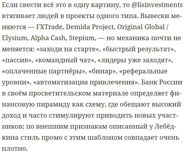 Мошенническая природа проекта видна по тому, во что предлагает вкладываться Илья. Последний проект FXTrade является откровенной финансовой пирамидой. На нем предлагают передать деньги некоей команде успешных трейдеров и получать за это 0,75% ежедневного дохода на пассиве.Также Илья Лебедкин замечен за продвижением таких лохотронов, как Demida Project, Original Global, Elysium, Stepium. Все они работали по одному принципу, привлекая депозиты и обещая начисление дохода на пассиве. Большая их часть уже успела соскамиться.
