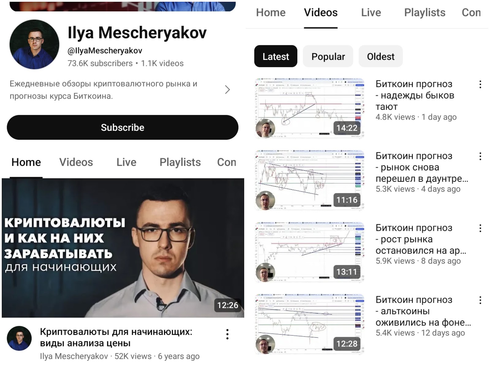Ютуб канал Илья Мещеряков посвятил прогнозам курса Биткоина. Иногда встречаются рекомендации для новичков по заработку на крипте. На данный момент автор опубликовал более 1 000 видео. В основном просмотры составляют 4-5k. Видеоролики публикуются часто.