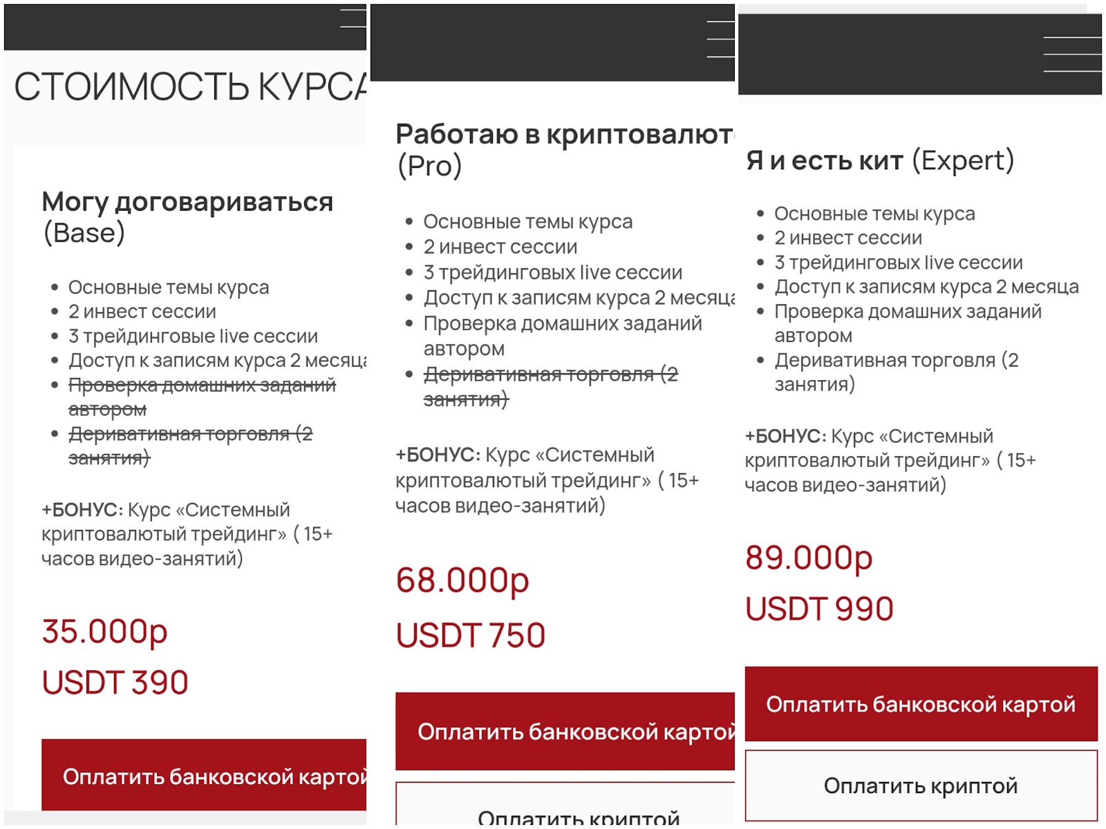 - Expert стоит 89 000 руб. (990 USDT). Ученики получат доступ к деривативной торговле. Еще предусмотрен бонус в виде курса по системному трейдингу