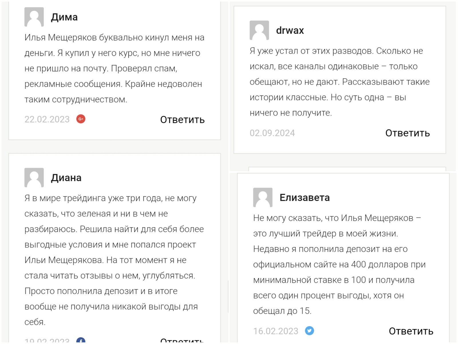В интернете мы нашли негативные отзывы о том, что Илья Мещеряков предоставляет некачественное обучение. По словам пользователей, рекомендации трейдера не помогают достичь успехов.