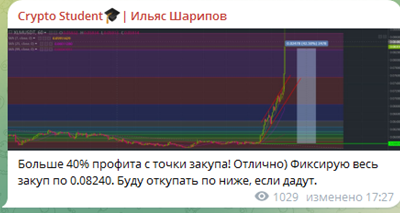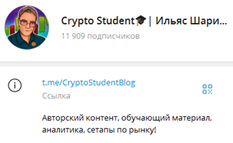 Трейдер Ильяс Шарипов – автор Телеграмм-канала «Крипто студент». В новостной ленте Crypto Student инвесторы могут найти обучающие материалы, технический анализ биржевых рынков и сведения об основных событиях индустрии. Но на этом деятельность трейдера «Крипто студент» в Телеграмме не заканчивается. Он администрирует закрытый чат, в котором проводит стримы с обзорами доходных сделок, выкладывает актуальные точки входа и прибыльные стратегии собственного авторства.