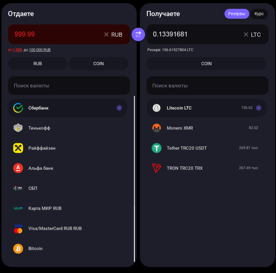 При выборе актива, ниже указывается минимальное и максимальное число, которое можно отдавать. Для получаемой валюты также указывается резерв, на который может рассчитывать трейдер.
