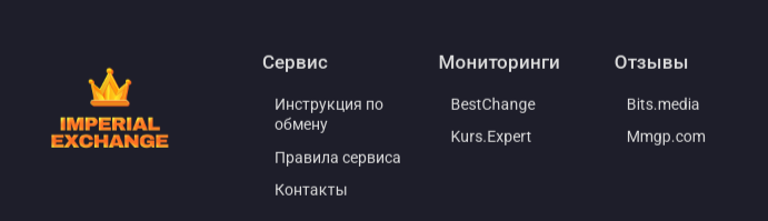 Imperial Exchange – классический обменник для криптовалют и фиатов. Только разработчики не стали указывать свои преимущества и возможности. Поэтому непонятно, почему клиент должен выбрать для работы именно этот ресурс.