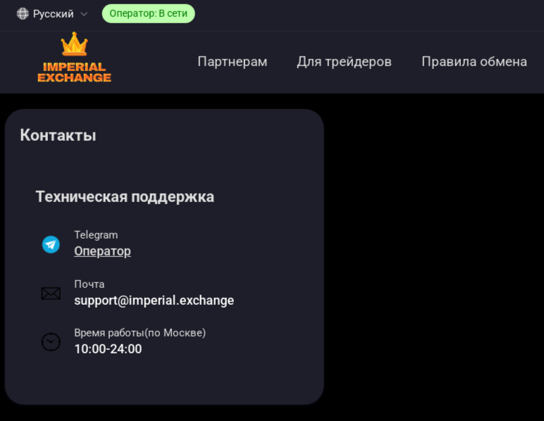 Лишь в разделе с контактной информацией мы увидели их электронный адрес и ссылку на менеджера @ imperialexchange adm, который работает в телеграм. Плюс, мы узнали что площадка работает с 10 до 24 часов по московскому времени.
