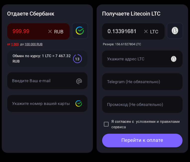 Для успешной транзакции здесь достаточно выбрать отдаваемую и получаемую валюты. Плюс, нужно указать номер счета, куда придут средства, а также поставить соглашение с правилами и условиями сервиса.