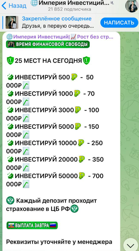 В телеграм-канале «Империя Инвестиций Рост без стресса» пользователям предлагают услуги по раскрутке счета под руководством специалистов. Люди могут инвестировать относительно небольшие суммы и через день уже получить в несколько раз больше. Автор канала обещает гарантии возврата средств, а также убеждает в честности данной работы, публикуя переписки с партнерами. В этой статье мы рассмотрим, можно ли здесь действительно раскрутить счет и заработать на этом или же пользователей ждет потеря денег на скаме.