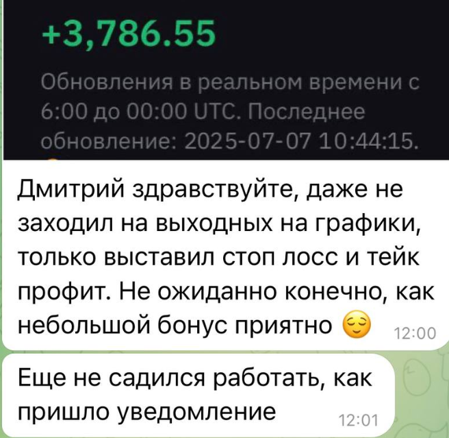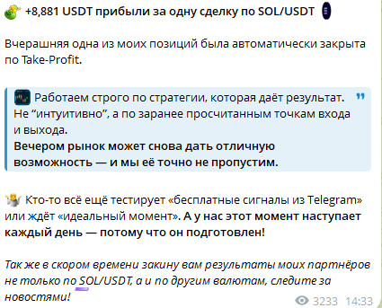 На канале также есть записи, которые подтверждают успехи других трейдеров. Один из них заработал на SOL $4,5 тыс., второй — $3,6 тыс., третий — $5 тыс. Дмитрий подчеркивает: эти люди получили доход, потому что «сделали главное» — доверились ему. Блогер утверждает, что от клиента требуется только действовать по инструкции, все остальное он берет на себя.