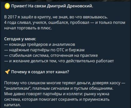 У Дмитрия нет собственного сайта или аккаунтов в соцсетях, которые рассказали бы о нем больше. Он не ведет паблики в Facebook или ВК. Получается, подписчики имеют о нем минимум данных. Единственный источник — «приветственный пост», который невозможно проверить на подлинность. Там он рассказывает, что торговал криптой с 2017 года, а потом создал свою систему и начал стабильно зарабатывать.