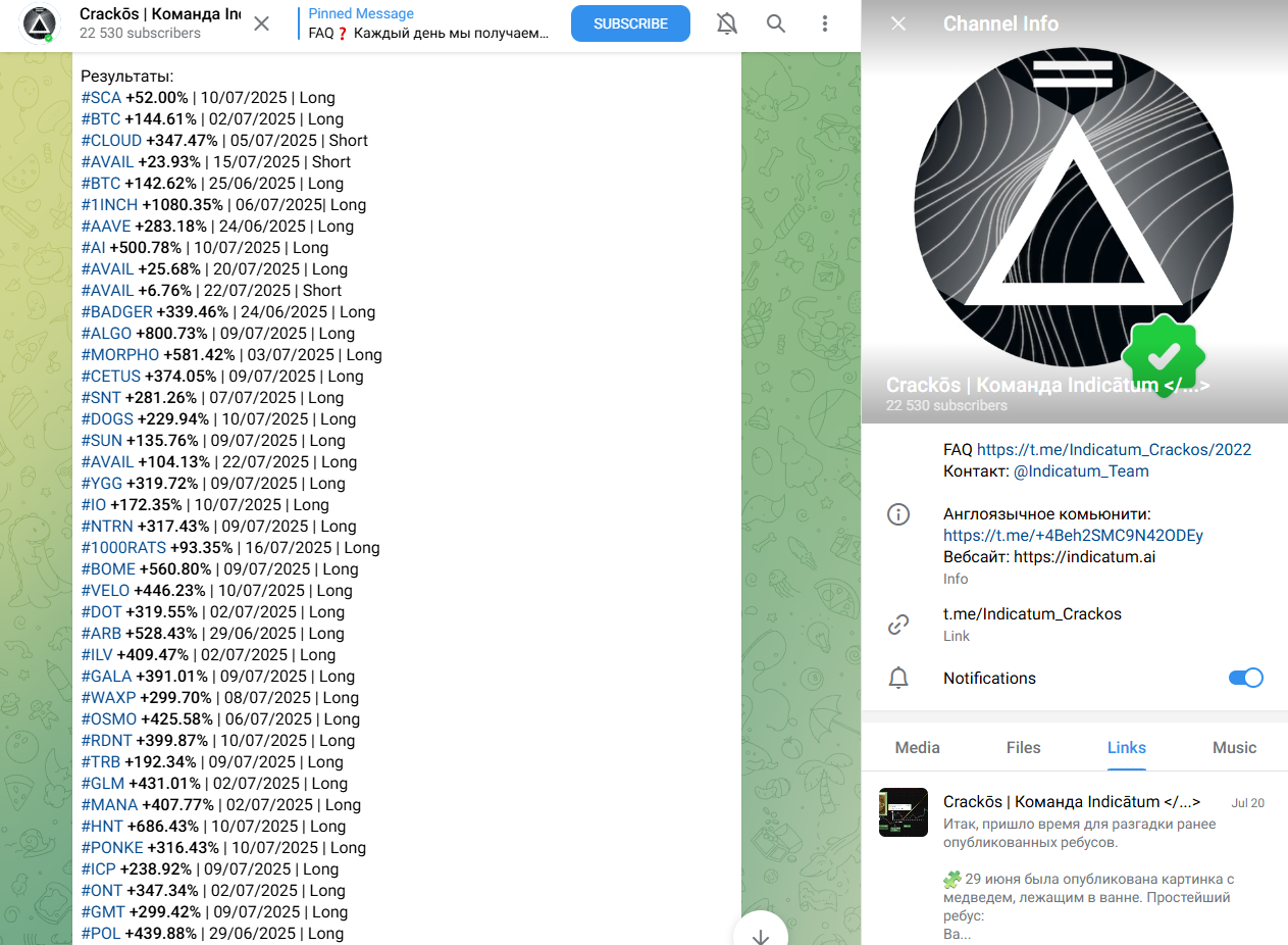 Официально индикатор Indicatum Crackos начал разрабатываться в 2018 году, а телеграм канал под RU аудиторию был создан более 7 лет назад. Сейчас он насчитывает более 22 тысяч подписчиков, из которых только 20% в среднем следят за публикациями. Вдобавок стоит отметить негативную динамику развития, ведь только за последний месяц отписалось более 500 пользователей, что может говорить об удалении ботов.