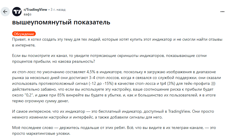 На первый взгляд обсуждений индикатора Indicatum Crackos в сети нет, однако на иностранном форуме Reddit можно заметить отзывы, где клиенты жалуются на потерю средств при торговле. По словам пользователей, команда разработчиков мало того, что требует внушительную сумму для получения доступа к бесплатному на TradingView индикатору, так еще и алгоритм приводит к сливу депозита. Также некоторые люди отмечают мошенничество с их стороны и воровство денег после перевода BTC.