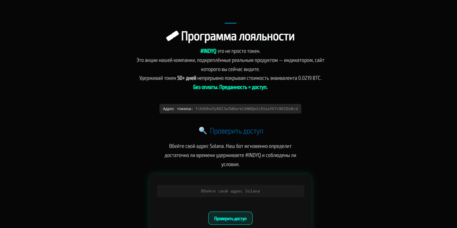 - токен: информация о программе лояльности, адрес токена, ссылка на биржу Jupiter, а также интерфейс для проверки выполнения условий.