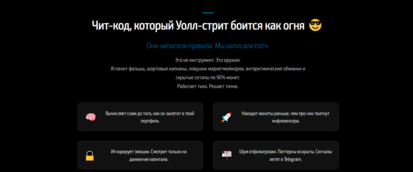 - индикатор: маркетинговое перечисление возможностей и особенностей алгоритма, заявления о работе с AI и поиске различных ловушек / капканов и скрытых токенов на рынке;