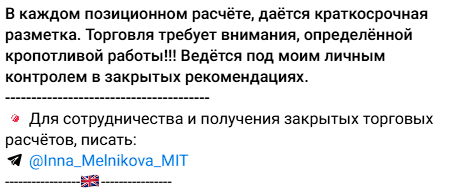 Но будьте внимательны, отсутствие прозрачной статистики сделок inna_melnikova_mit — один из возможных признаков мошенничества. Подписаны на канал Инны Мельниковой или успели с ней посотрудничать? Поделитесь своим отзывом об Inna Melnikova «Трейдинг и Финансовые рынки» ниже в комментариях на нашем сайте.