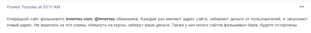 Если и удалось что-то найти об обменнике, то лишь отрицательные комментарии людей. Пользователи выражают свои опасение по поводу скам моделей в Innertax com.