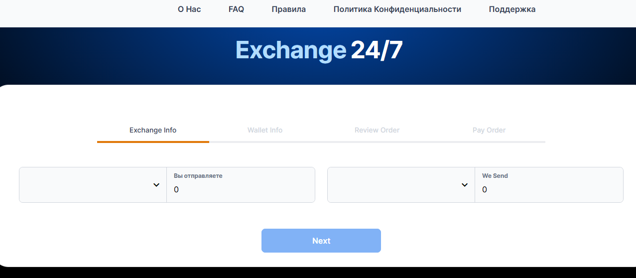 Техническая начинка завязана на веб-интерфейсе с адаптивным дизайном — нормально используется как с ПК, так и с мобильного устройства. Интерфейс довольно понятный: минимум кнопок и лишних полей. Алгоритм простой — выбрал направление, вбил сумму, подтвердил заявку. Курс считается на основе усреднённых данных с нескольких бирж и P2P-площадок, так что офферы по обмену обычно адекватные. Комиссия не фикс, а зависит от объёма и направления. Но финальные цифры по курсу и комиссии видно ещё до подтверждения.