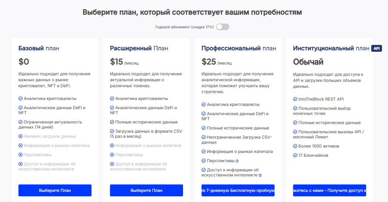 Компания IntoTheBlock предоставляет пользователям бесплатные и платные услуги. Для анализа состояния рынка криптовалют трейдеры могут воспользоваться несколькими тарифными планами на выбор: