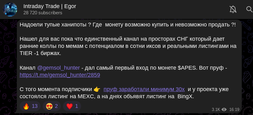 За чуть более 1 год деятельности сообщество набрало аудиторию в 28,7+ тысяч подписчиков. Количество довольно внушительное, однако есть подозрение в искусственной накрутке аудитории. При таком объеме пользователей посты просматривают в среднем чуть более 2 тысяч человек, а вовлеченность составляет 3.45%, что для телеграма с хайповой тематикой крайне мало.