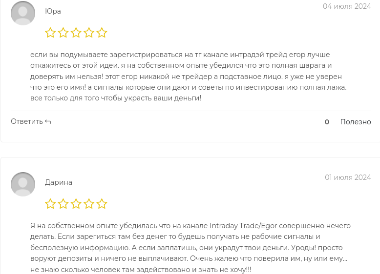 - Отрицательные отзывы, в которых пользователи пишут про развод со стороны админа Intraday Trade Egor telegram.