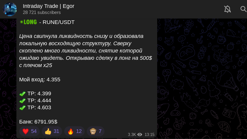 Intraday Trade Egor telegram — инвестиционный паблик в мессенджере, заточенный под работу с криптовалютными активами. Про диверсификацию трейдер не слышал или преднамеренно не упоминает распределение рисков по другим активам. Ведь Егор не затрагивает фонды, фиатные валюты, ценные бумаги, как источник снижения инвестиционной волатильности. Помимо этого создалось впечатление, что автор телеграм-канала по инвестициям предпочитает краткосрочные сделки с монетами, имеющими повышенную волатильность. На них зарабатывать можно, но необходимы навыки планирования и анализа.