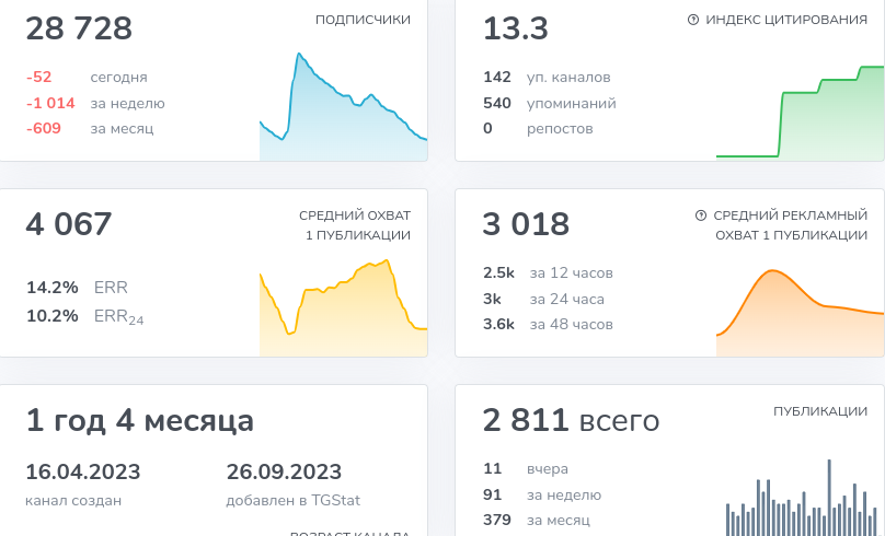 | Изменение количества подписчиков | Канал находится в красной зоне, т.е. активно теряет пользователей. За прошлый месяц отписались свыше 600, а за эту неделю — 1014 |