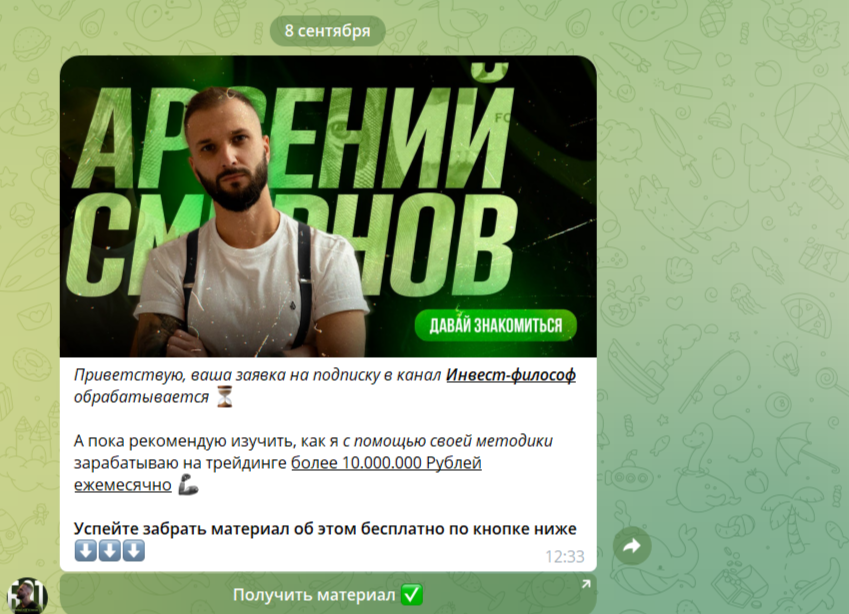 Доступ к тг каналу Инвест Философ закрыт. Пользователю необходимо подать заявку, ответить на сообщения бота, а только потом приступить к изучению контента из сообщества. После отправления заявки на вступление юзеру напишет БОТ Инвест Философа. Через него пользователь может узнать о стратегии инвестора, о его личности и о гарантиях работы.