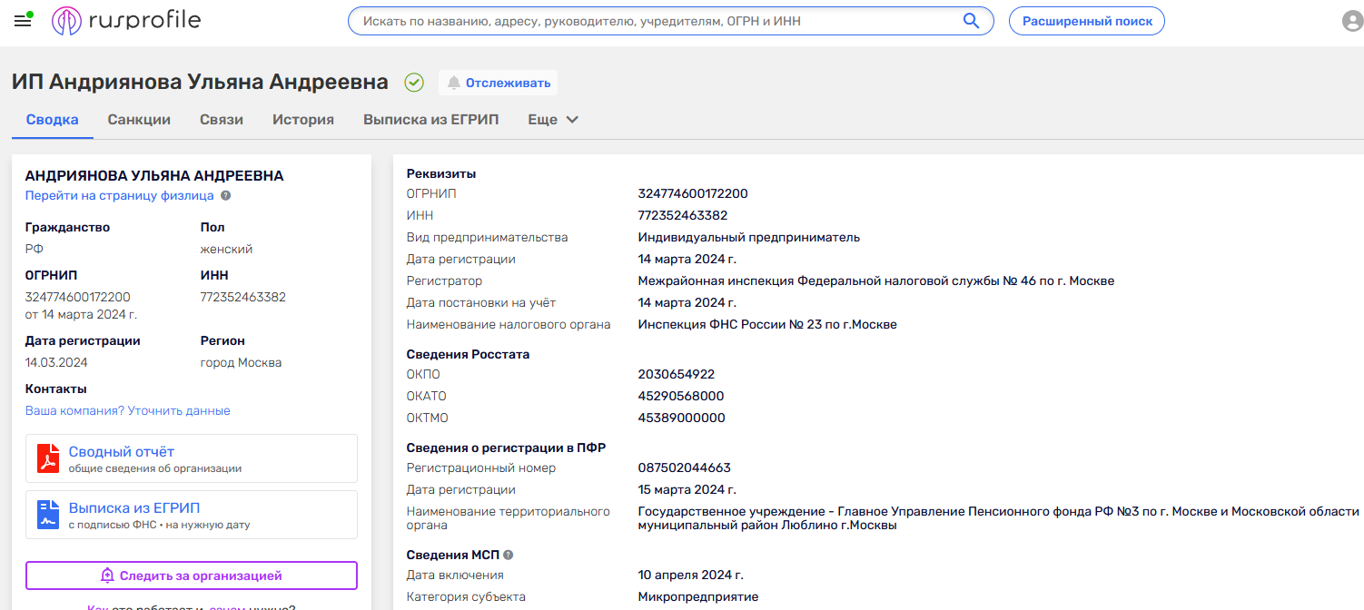 В качестве гарантий даже предоставляется ссылка на rusprofile с данными об официальной регистрации ИП.