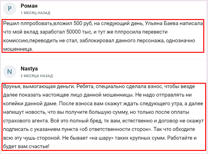 В негативных отзывах пользователи демонстрируют доказательства того, что проект «Инвест Ульяна» скам. Поэтому каждый, кто вложит сюда деньги, больше их не увидит.