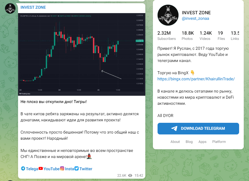 Мем-коин принадлежит довольно известному трейдеру под ником Invest zone в telegram. Его аудитория действительно масштабна: на один только канал в Телеграмме подписаны свыше 2,3 миллионов человек. А помимо него трейдер также ведет канал и на YouTube.