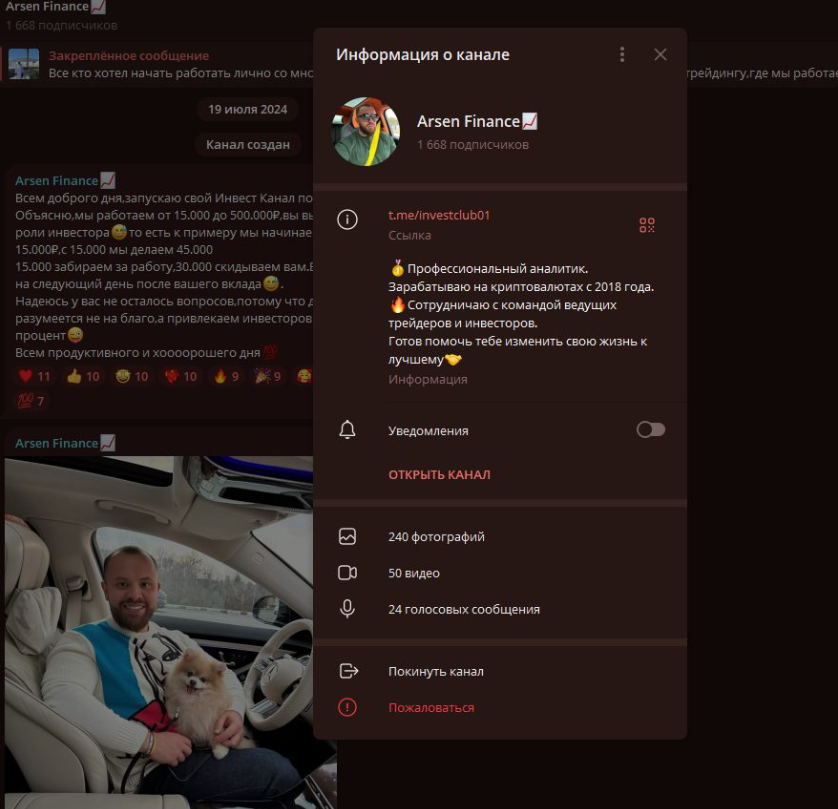 Канал investclub01 в Telegram работает с 19 июля 2024 года. К концу лета 2025 там около 1 700 участников. Вовлеченность заметная: просмотров примерно столько же, сколько подписчиков, под постами в среднем около 50 реакций, иногда больше. Арсен Авдеев в Telegram – arsenavdeev6. По его словам, он в трейдинге с 2018 года и позиционирует себя как опытного трейдера, который обеспечивает доход инвесторам. В описании канала обещают утроить вложения. Модель простая. Вы вносите, например, 15 000 рублей. По завершении «инвестпроцесса» автор обещает «двукратную прибыль». Он удерживает свою долю из заработка и обещает выплату на следующие сутки. Результаты подтверждает скриншотами переписок, фото переводов и иногда видео с «довольными вкладчиками». Какая именно платформа у него в 2025 году неясно. В канале есть запись от 16 сентября прошлого года, где показана торговля на бирже BingX. Про BingX в сети много критики. Пользователи пишут о подозрительных схемах, слабой поддержке, спорных графиках и технических сбоях. Это отзывы, их стоит перепроверять. При этом Арсен не зовет всех торговать на BingX. Он предлагает доверить ему управление и просто внести деньги, обещая еженедельные отчеты. Бесплатного контента в канале нет. Ни открытых рекомендаций, ни базовых консультаций до сделки. По сути, публикуется только информация о стоимости участия.