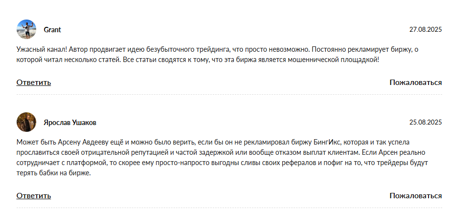 По отзывам об инвест‑деятельности Арсена Авдеева тон в целом негативный. Это мнения пользователей, их стоит перепроверять. Многие недовольны результатами. Обещанная доходность не подтверждается, а с возвратом денег возникают трудности. Люди пишут, что ожидания и реальность расходятся. Часто жалуются на срывы сроков выплат. После получения средств, по словам комментаторов, автор перестает выходить на связь. Встречаются истории о блокировке аккаунтов в Telegram и игнорировании запросов на возврат. Под подозрением и «успешные кейсы». Часть аудитории считает, что скриншоты переписок и видеоотзывы могут быть подделаны. Говорят, что материалы выглядят постановочно и не отражают реальную картину. Отдельная претензия – нет бесплатных материалов и консультаций до сделки. Для многих это красный флажок и признак сомнительной схемы, где фокус на сборе денег, а не на результате.В сумме отзывы рисуют картину проекта, которому сложно доверять. Если все же думаете о сотрудничестве, запросите четкие условия выплат и возвратов, подтвердите личность и опыт автора и найдите независимые подтверждения результатов, и только потом переводите средства.