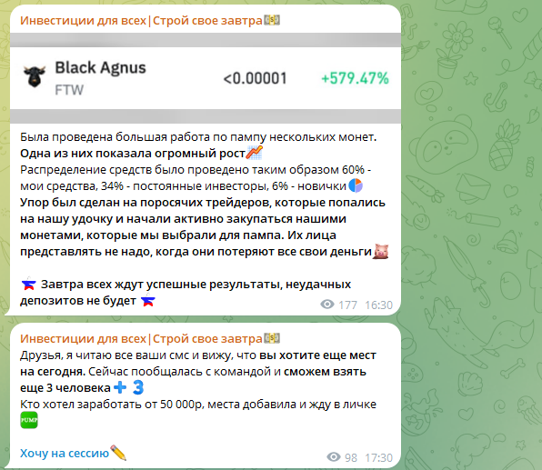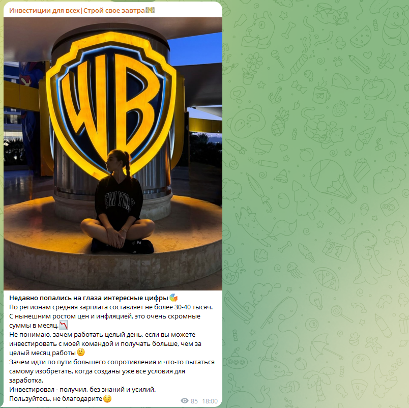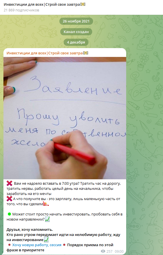 «Инвестиции для всех | Строй свое завтра» – это телеграмм-канал, в рамках которого подписчикам предлагают возможности получить прибыль без усилий. Нередко такие услуги оказываются разводом, потому что рассчитаны на доверчивых инвесторов.