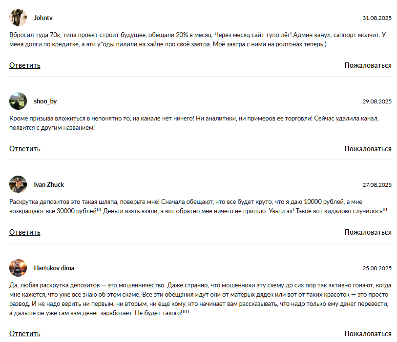 На канале регулярно выкладывают комментарии подписчиков, представленные в виде скриншотов – если судить по этим записям, проект работает честно и всегда делится прибылью с участниками сессии. Нужно понимать, что сфабриковать такие картинки не составляет труда и они не могут являться гарантией.