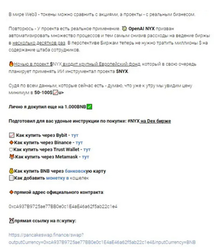 Посты на канале не отличаются разнообразием. Это редкие перепосты новостей, мотивационные записи об инвестициях на крипте. Последнее время часто выставляется реклама токена OpenAI NYX. Он представлен в качестве инновационной монеты для автоматизации процессов и снижения расходов на бирже. Разработчиком указан некий европейский фонд, которому приписываются крупные прибыли.