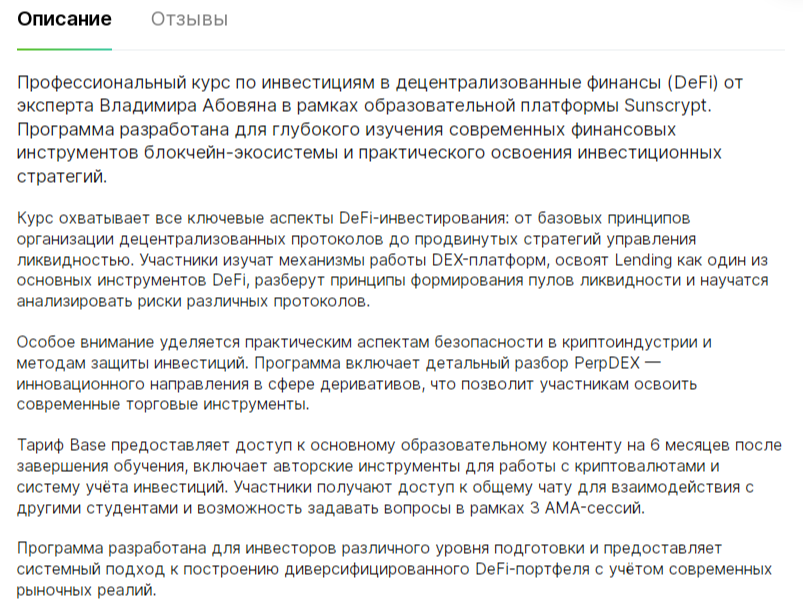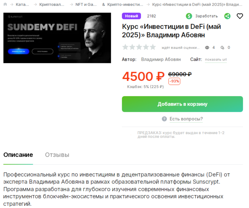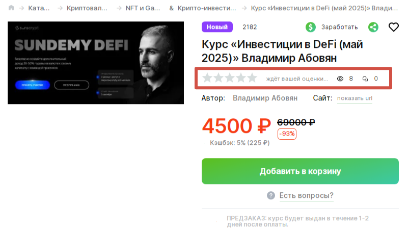 Положительных отзывов о его обучениях нигде нет. Непонятно, почему кто-то решил продавать курс Владимира «Инвестиции В Defi Май 2025» на стороннем сайте дешевле, ведь данная программа никак себя не зарекомендовала. Оценок у продукта тут пока нет, так как он появился всего 1 день назад.