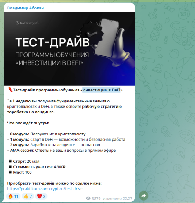 В телеграм-канале таких детали об обучений «Инвестиции В Defi Май 2025» нет. 15 мая 2025 года Владимир Абовян выложил пост, что проводит тест-драйв этого курса, на который выделил 100 мест за 4 900 рублей. Об официальном запуске и полноценной стоимости курса информации не видно. Отзывов от учеников тоже не видно.