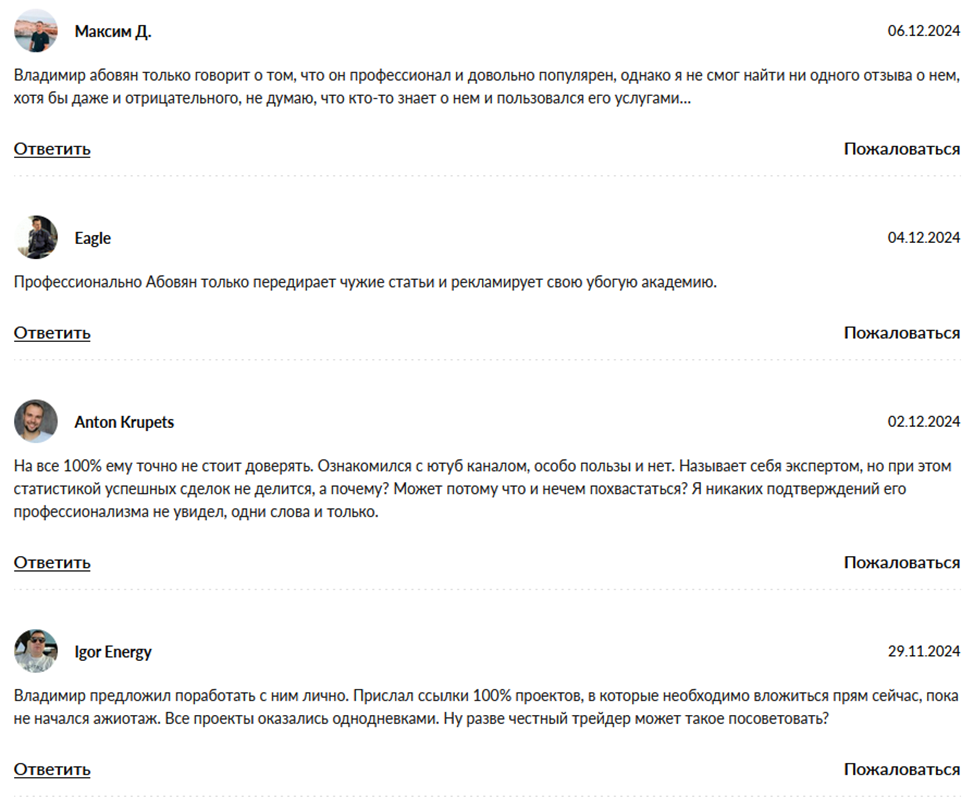 В интернете в адрес инвестора есть несколько разоблачений и негативных комментариев. Пользователи рассказывают, что мужчина является обычным инфоцыганом. Он называет себя профессионалом и обещает высокий доход, а на деле обманывает на деньги.