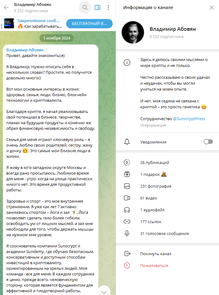Владимир Абовян ведет несколько социальных сетей и везде рассказывает о криптовалюте. На официальных источниках мы не нашли информацию об актуальных платных обучениях от инвестора.