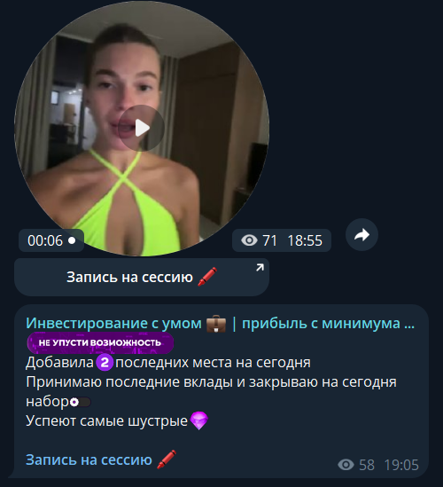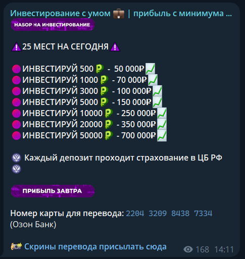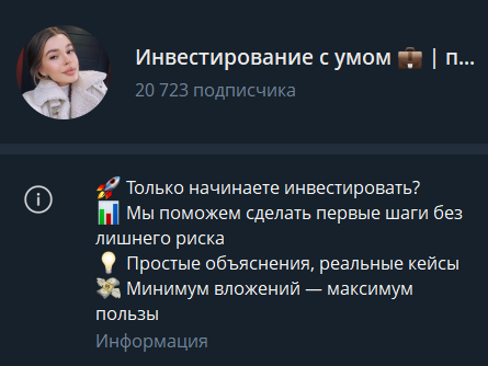 Инвестирование с умом прибыль с минимума — канал в ТГ с услугой раскрутки депозитов. Его ведет девушка-трейдер по имени Елизавета, которая обещает зарабатывать для клиентов огромные суммы, а им для этого потребуется всего несколько сотен рублей.