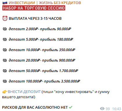 Автор Евгений Анатольевич предлагает заработать на инвестициях. Якобы у него есть способ каждый день увеличивать депозит своих клиентов. Администратор проекта пишет, что он трейдер и каждый день проводит торговые сессии. Зарабатывает много, и чтобы помочь людям, он раскручивает их счета.