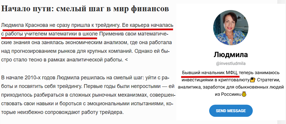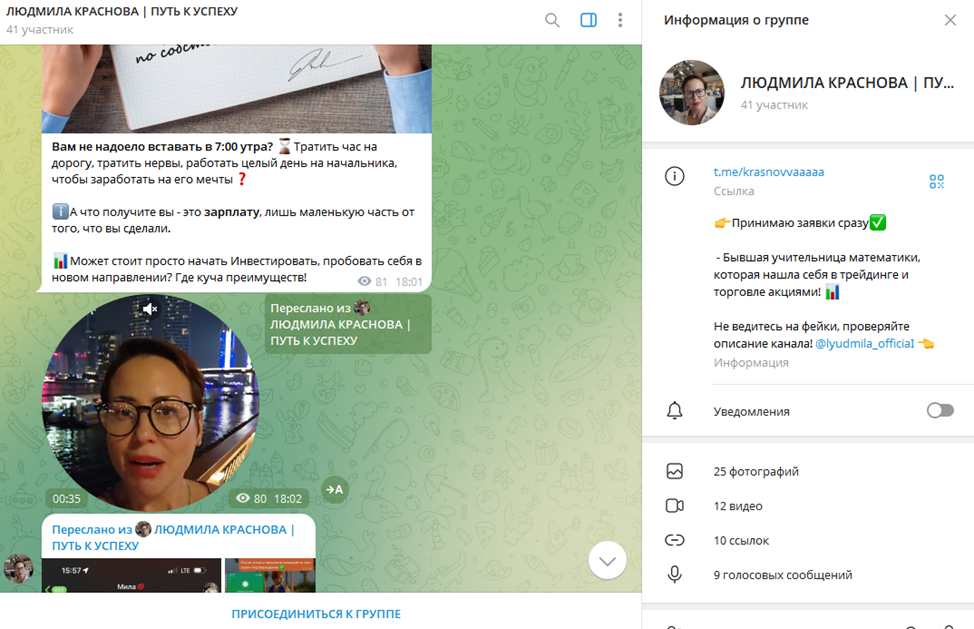 Путаница с биографиями аналитика вероятно произошла из-за многочисленных каналов-дублей, которые регулярно появляются в Телеграмме. «СОЦИАЛЬНЫЙ ЗАРАБОТОК | Только для наших», «ЛЮДМИЛА КРАСНОВА | ПУТЬ К УСПЕХУ» и другие вещают от лица трейдера, предлагая идентичные инвестиционные услуги.