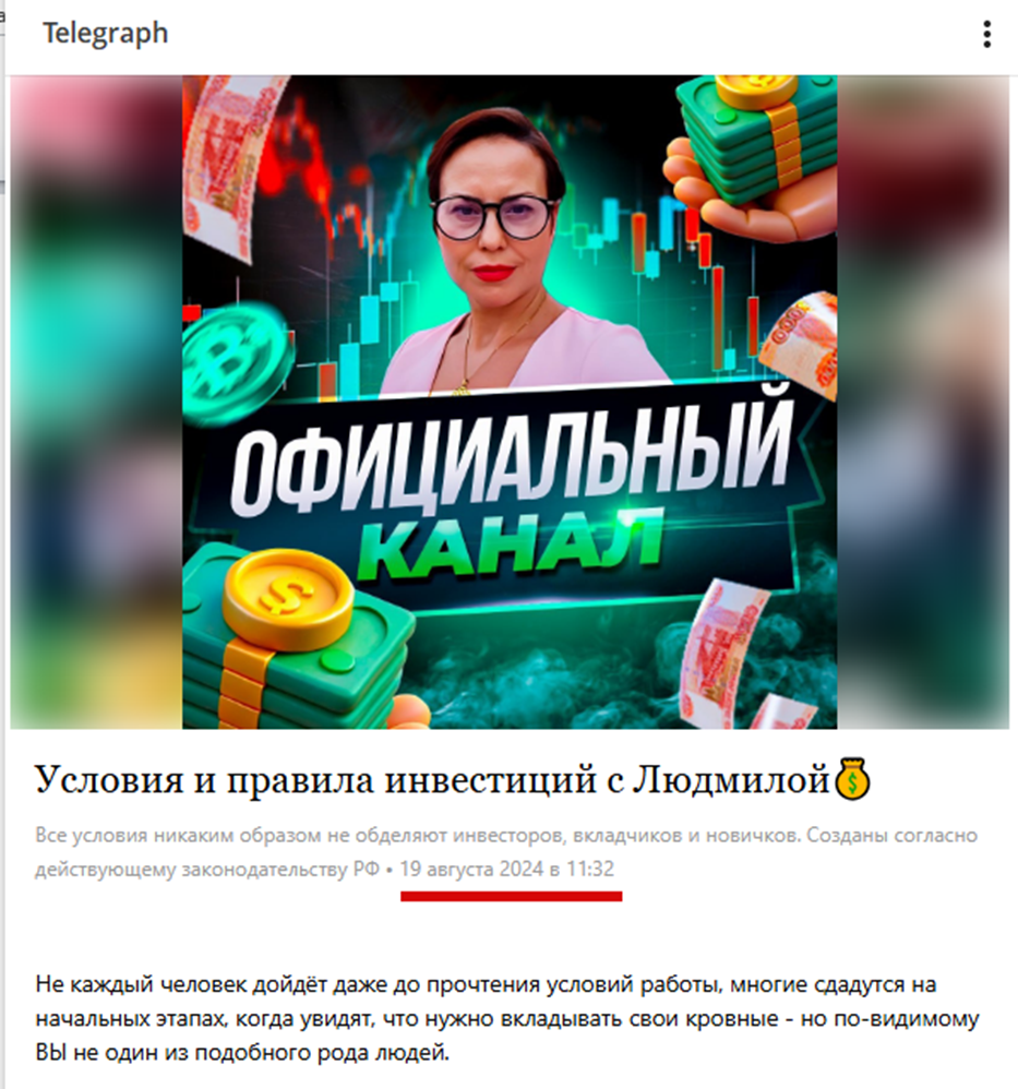 Подробные условия, о которых не упоминается в рекламных сообщениях, есть в оферте «Условия и правила инвестиций с Людмилой». Документ опубликован 19 августа 2024 года, задолго до фактического создания канала «Уверенный доход | РОССИЯ».
