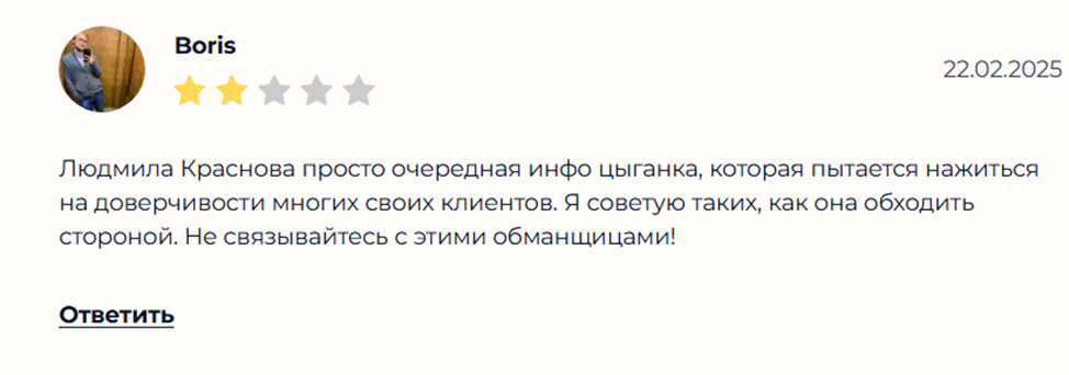 Если откинуть фейковые отзывы, опубликованные в ТГ «Уверенный доход Россия» и на поддельных сайтах, финансовые услуги эксперта вызывают только гнев и недовольство. Клиенты пишут, что вместо прибыли потеряли значительные суммы, а все попытки объясниться с «экспертом» закончились попаданием в «черный список».