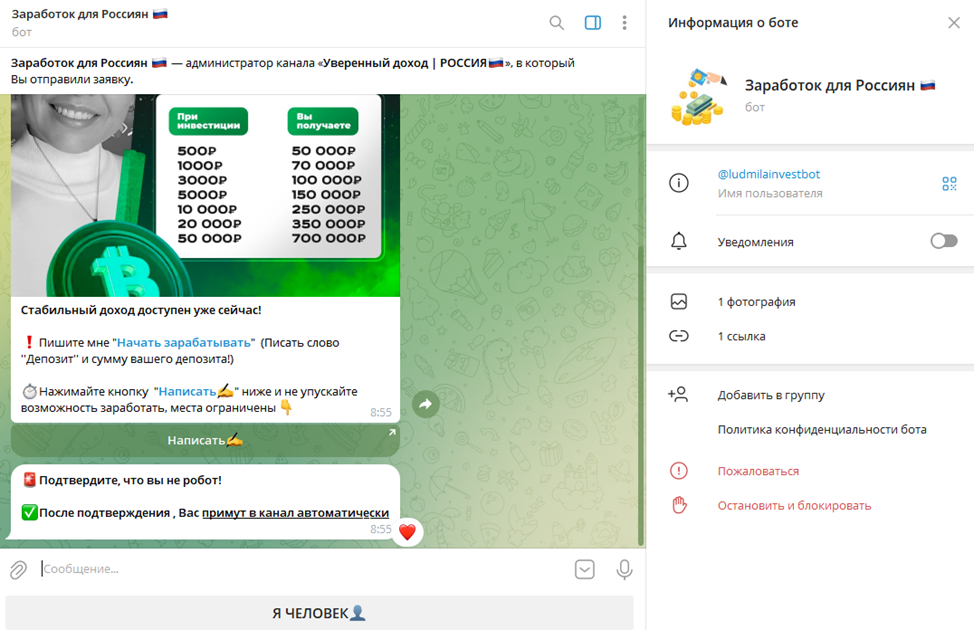 «Людмила Инвест» работает с клиентами только в Telegram. Основной информационный канал активно продвигает услуги по раскрутке депозита с 15 марта 2025 года.